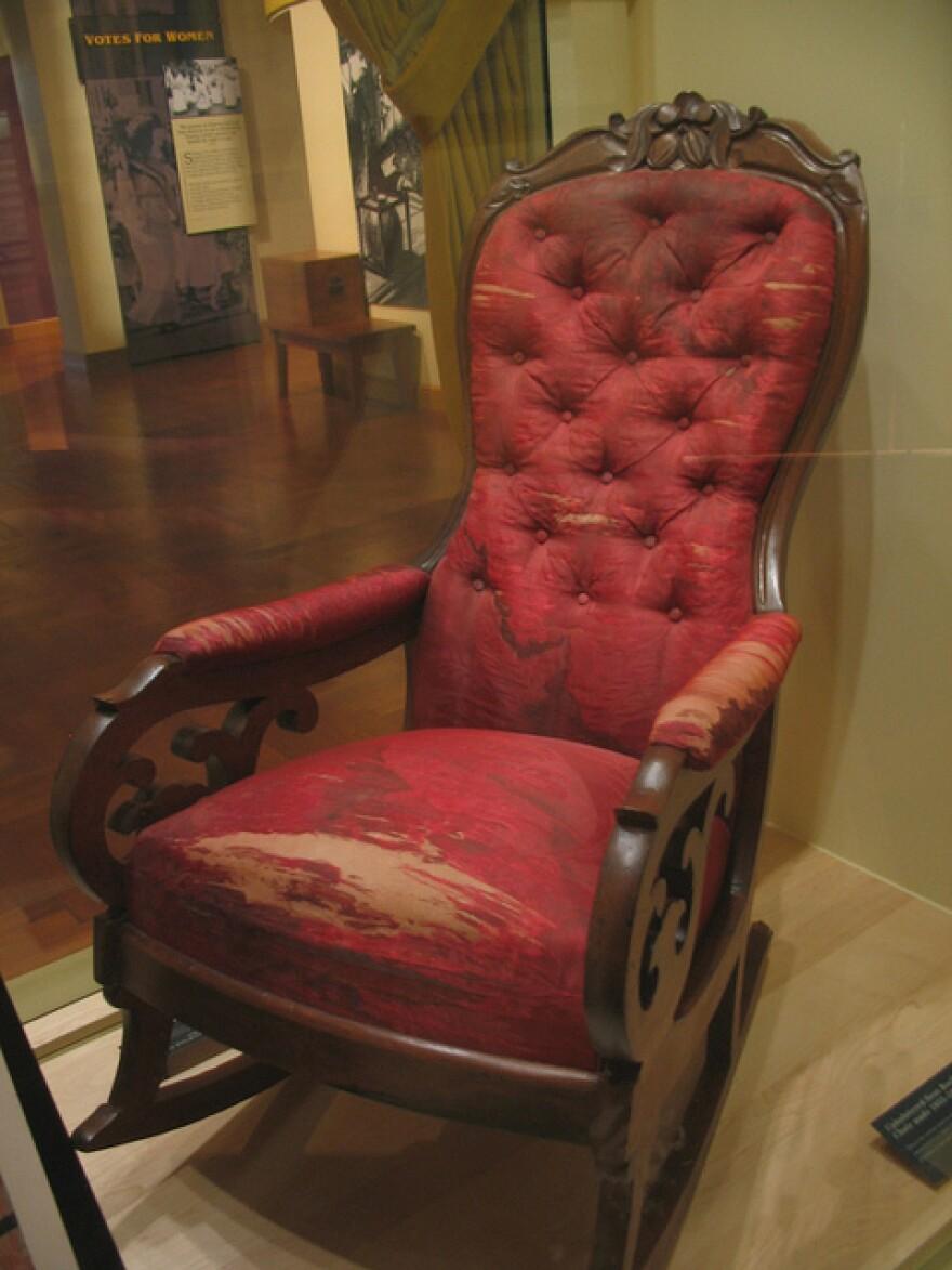 When I’m not grading papers or working on lesson plans, I enjoy watching movies and t.v. shows with my family. Some of my favorite shows are The Mandalorian, Halo, and The Bear. I love reading books and graphic novels too. Some of my favorite authors are Linda Nichols, Judy Blume, and Dean Koontz. I also love traveling every summer with my family. So far, we have been to 45 states. One of my favorite places we have been to is the Henry Ford Museum in Dearborn, Michigan. It is so cool and educational! It has everything you can imagine from Rosa Parks’ bus to the rocking chair in which Abraham Lincoln sat when assassinated. (Put it on your bucket list!) Things that I wish I could do better are: cook, exercise on a regular basis, and wear heels. (Lincoln’s Bloodstained Chair)